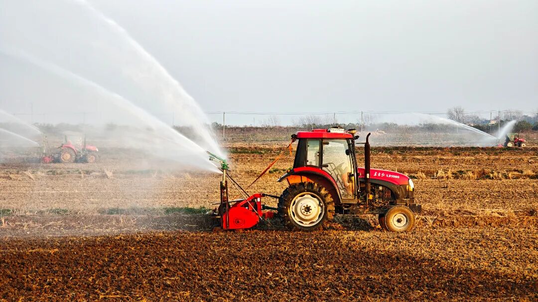 华阳河农场针对部分晚稻茬小麦土壤墒情不足的情况,迅速组织喷灌抗旱,实施精准补水,确保稻茬麦齐苗越冬。(李龙)
