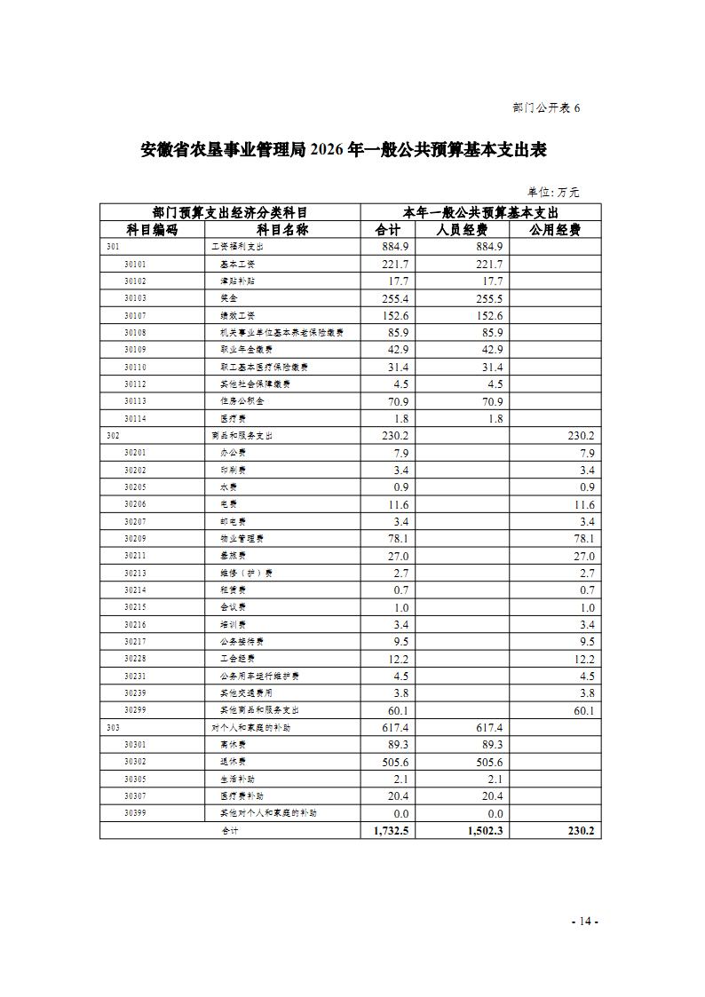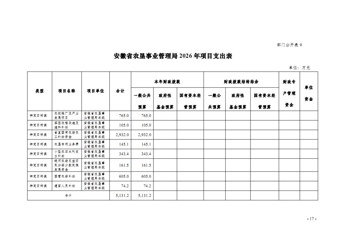 安徽省农垦事业管理局2026年部门预算