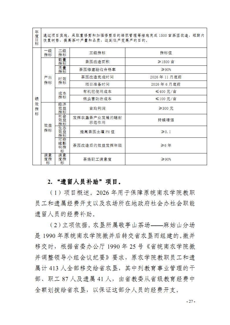安徽省农垦事业管理局2026年部门预算批复的其他项目绩效目标