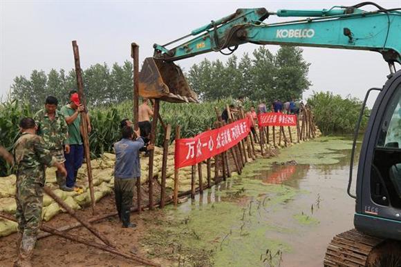 7月7日清晨4点,华阳河五场80多人的党员突击队抢险队就开始了抢筑西圩生命圩堤的战斗。党员抢险队队员们顶着烈日,打桩、运桩、装包、杠包,压包,汗水裹着泥水,争分夺秒,奋力封堵着缺口直到上午10时,那些没有来得吃早饭的队员们简单地吃点饼干,喝点矿泉水,又继续投入战斗,傍晚7点多钟。历时14个小时,共动用挖掘机2台,打木桩100余根,码放编织袋2000余包,抢打隔堤高程达18.5米,成功完成了缺口封堵,保住了西圩生命线,创造了溃口重建的“奇迹”!