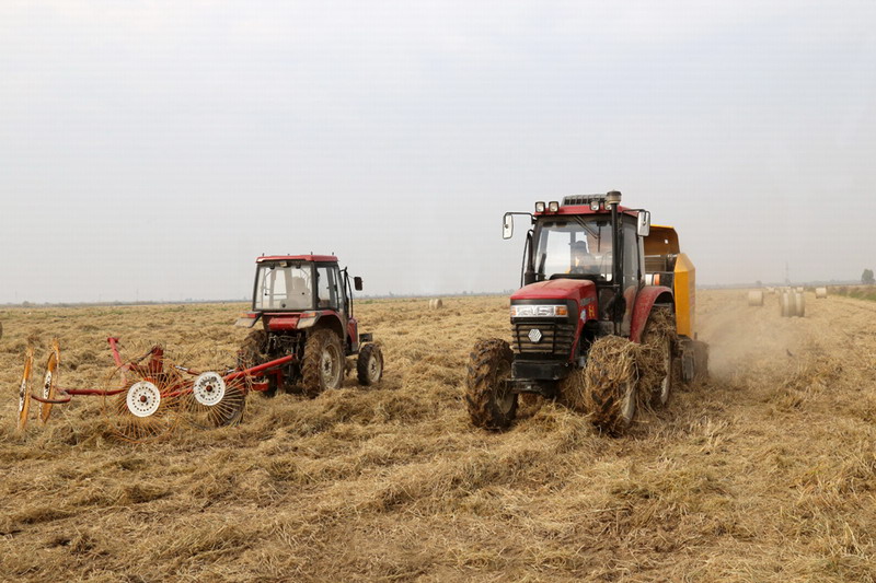 能否用市场化办法来破局?场长孙国安深入场内各农机合作社寻计问策。农场精五合作社联系到安徽省规模最大的农机合作社——含山县乾地源合作社,对方调来20多台国产沃德奥龙1104打捆机、搂草机、叉草机,助力农场稻秸禁烧。据乾地源合作社负责人白江介绍,如果天气晴好,3-4天就可完成农场3万亩水稻的秸秆打捆回收作业。