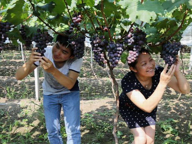 连日来,安徽淮南农场高效农业观光园内,一串串黑珍珠似的葡萄挂满枝头、香气醉人,葡萄架下欢声笑语此起彼伏。种植户张香兰正忙着帮前来采摘的客人装箱,见到笔者,她满面笑颜地说:“我家去年种下葡萄苗,今年就挂果了,每亩不下2000斤,每天都有来采摘的游客和水果批发商,目前平均每斤卖到10元,这深紫色的夏黑品种最好销!”据测算,今年淮南农场葡萄亩均效益超万元,真正实现了农业增效、职工增收的目标。