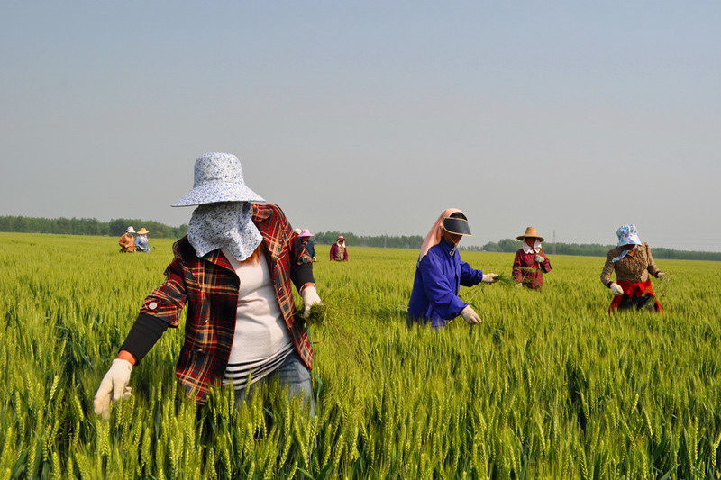 5月7日,安徽农垦潘村湖农场五分场刘开兰家庭农场正组织人力在小麦种子田去除杂株劣株,以确保田间麦种纯度。