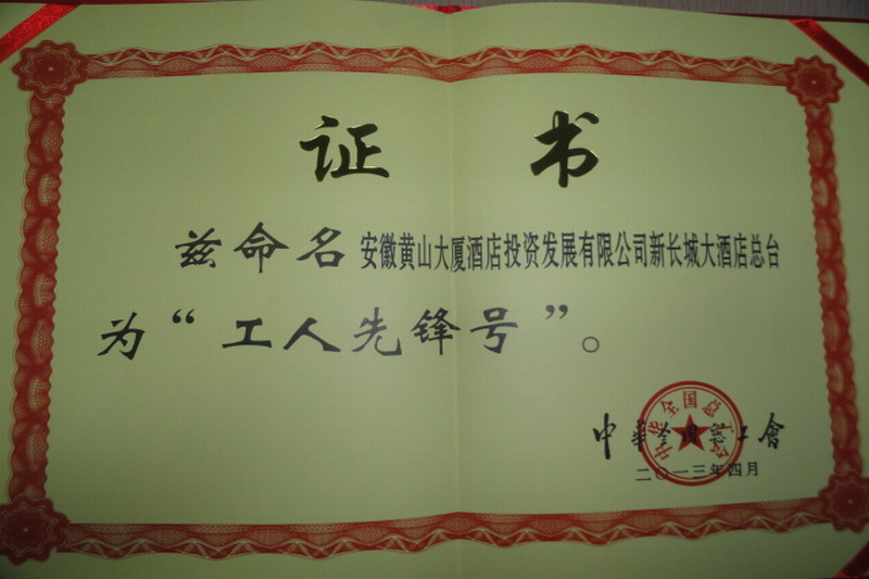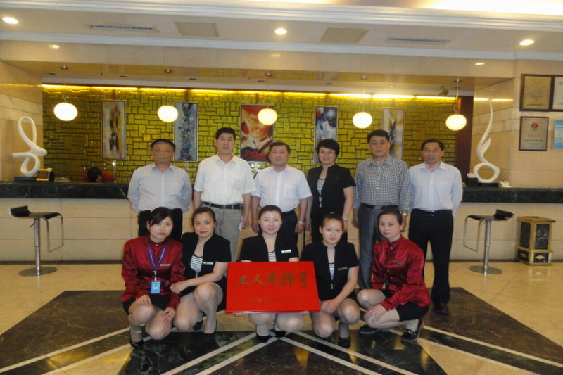 今年4月,中华全国总工会命名安徽农垦酒店管理集团新长城大酒店总台为“工人先锋号”。5月30日下午,省农林水工会、省农垦集团工会、酒店管理集团工会负责人来到该酒店,会同总经理蔡荣生、副总经理徐玉玲举行了简短的授牌仪式。