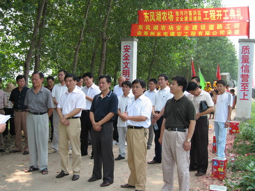 8月28日上午,东风湖农场淮河行蓄洪区安全道路建设工程开工典礼在一阵锣鼓鞭炮声中隆重举行,场领导及施工单位、工程质量监理部门的有关人员参加了开工仪式。这项道路建设工程是继上半年通达工程二分场至何毛公路段建成后的第二期建设项目,建设总长为3.2公里。工程竣工后,位于行蓄洪区的一、二分场主干道的硬化路面将全线贯通,农场的交通条件将得到根本改善。