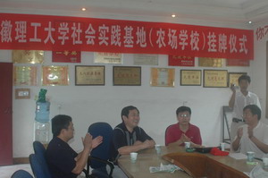 7月12日上午,安徽理工大学社会实践基地落户淮南农场,上午9:30在喜庆的鞭炮声中,挂牌仪式隆重举行。场党委副书记、纪委书记张文权和安理大工程机械系党总支书记王教授出席挂牌仪式。仪式结束后,农场有关负责人向安理大师生介绍了淮南农场的工农业生产情况和社会主义新农村建设的思路与举措。 安理大社会实基地落户淮南农场将有利于提升农垦知名度,扩大社会影响,促进农场科技进步、和谐发展。