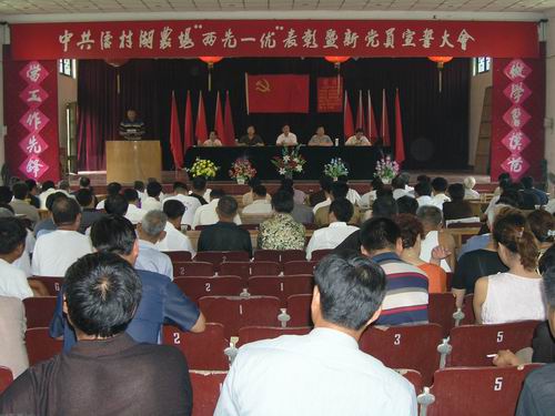 潘村湖农场于7月16日上午召开“两先一优”表彰暨新党员宣誓大会。全场有3个党支部、15个党小组、32名党员分别获得2005年度先进党支部、先进党小组、优秀共产党员称号。会上进行了简朴热烈的颁奖仪式,党委书记韩大鸣、副书记林贤传、党委委员陶卫东、李先金、童俊为获奖单位颁发了锦旗和奖状并与受表彰的优秀党员代表合影。大会宣布了党委关于预备党员转正和发展新党员的批复,12名新党员在鲜红的党旗前举手宣誓,与会的全体党员一起重温了入党誓词。优秀党员代表和新老党员代表在会上做了发言。会议还进行了党课教育活动,党委副书记林贤传就共产党员如何在企业三个文明建设中发挥好先锋模范作用做了专题辅导。会议结束前,党委书记、场长韩大鸣就去年以来全场党建工作及当前的形势和任务做了重要讲话。图为大会场景。(杨登宏摄)