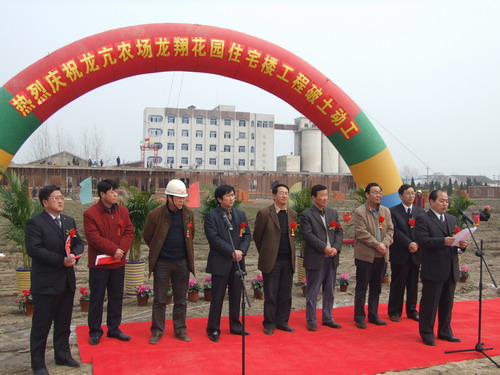 春风送暖,万物复苏。3月12日,龙亢农场龙翔花园职工住宅楼工地上彩旗飘扬,鞭炮齐鸣,锣鼓喧天,当最后一锨黄土覆盖住奠基石碑,宣告惠及全场职工福祉的德政工程——龙亢农场社会主义新农村建设龙翔花园职工住宅楼正式开工。集团公司领导田文俊、李卓民、刘超、李家堂、集团公司各处室负责同志、场领导杨俊宇、朱为荣、张建民、刘梅、李应河、程希文、全体机关工作人员、农业分场干部、雁湖面粉公司部分领导、监理单位代表、施工单位代表以及部分场区职工群众等参加奠基仪式,场党委副书记张建民主持开工奠基仪式。