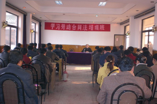 《中华人民共和国劳动合同法》将于2008年1月1日起施行,为了加强全场管理人员对《劳动合同法》的学习和了解,正确运用《劳动合同法》处理劳动关系,规范企业劳动合同管理,避免劳动争议发生,构建企业和谐稳定的劳动关系。12月4日下午,大圹圩农场邀请天长市劳动局和天长市劳动监察大队有关专业人员来场举办《劳动合同法》专题辅导培训班。场领导和全场管理人员50多人参加培训。