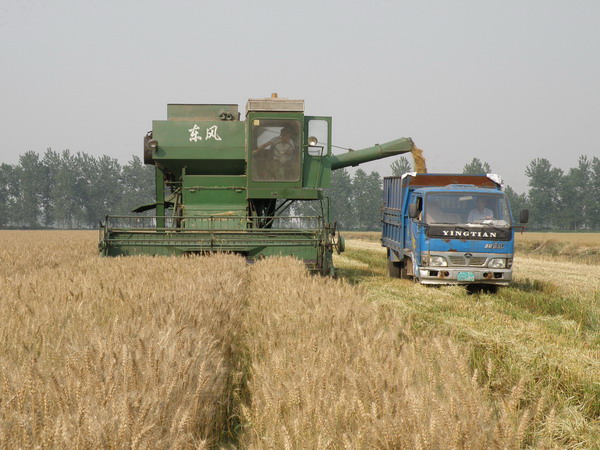在农业第三管理区一户成熟较早的36亩麦田里,一台安装了秸杆粉碎装置的大型“东风”收割机带着强劲的轰鸣声,缓缓行驶在金色的麦浪中,同时在田里穿梭作业的还有一台运粮车,一台装有灭茬装置的大马力轮胎车。徐成银场长、管理区班子成员、部分职工在麦收现场观摩机械收割及秸杆、麦茬粉碎情况。随着第一车满载的粮食顺利登场,人们脸上露出了丰收的喜悦。