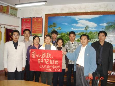 10月26日,龙亢农场中学高二文(2)班患病脊椎炎的胡丹丹和她的家长,以无比感激的心情接过了龙亢农场中学全体师生捐献的6472.1元钱时,激动的说不出话来。