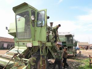 为迎接即将到来的“三夏”战役,潘村湖农场及早 做好农机具的检修工作。图为七分场职工正在对联 合收割机进行保养检修。(杨登宏摄)
