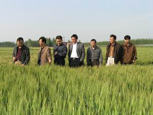 在农场期间,李总一行还来到正在建设中的农场移 民迁建工程之“蟠龙花园”小区建设工地,考察了 工程进度情况。图为李卓民副总经理在大田察看小 麦长势。(杨登宏)